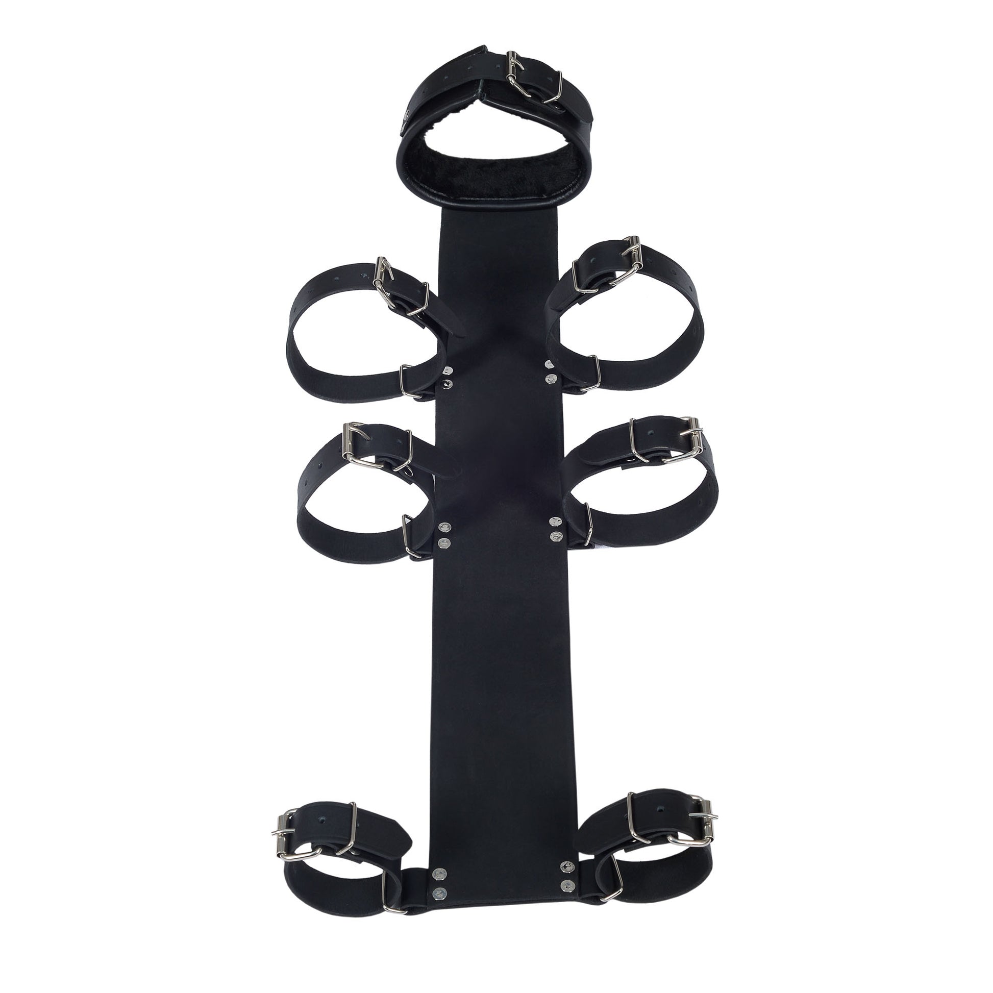 • All-in-One Restraint System – Includes a leather neck collar connected to wrist cuffs behind the back for controlled slave positioning.