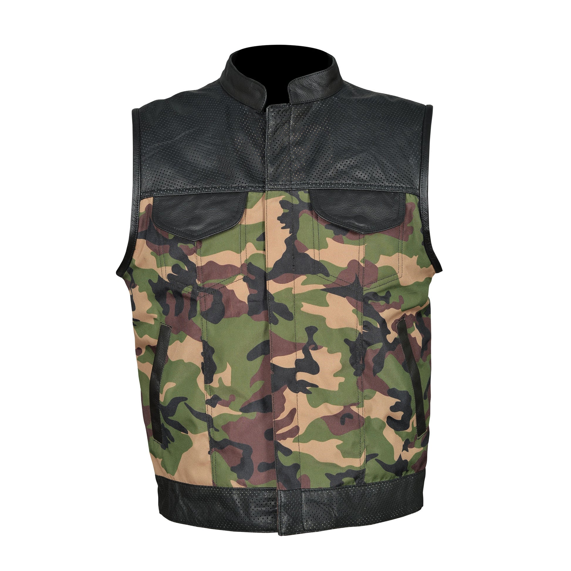 Crafted from durable leather and printed with a rugged camouflage finish, it features a snap-front closure, broad shoulders, and a cut designed for comfort over your favorite hoodie or flannel. Ideal for those who live loud, ride hard, and stand out.